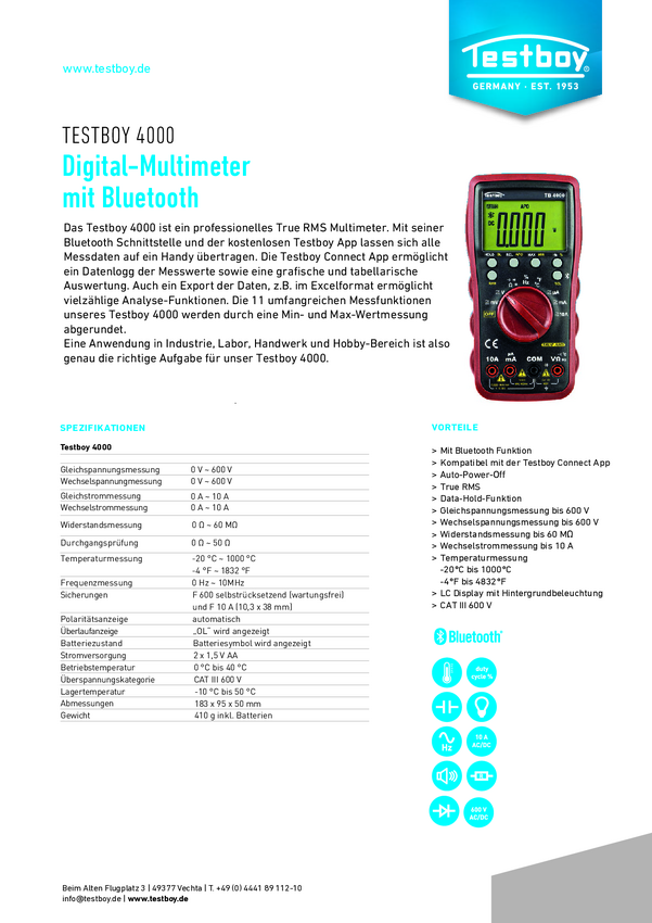 Multimetr cyfrowy Testboy 61412000-ISO, CAT III 600 V, AC/DC, kalibracja ISO