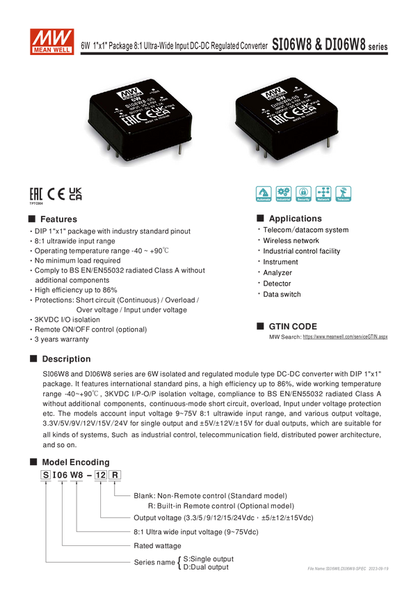 SI06W8-03 MW Mean Well SI06W8-03 Przetwornica DC/DC, do PCB 48 V/AC 3.3 V 1.5...