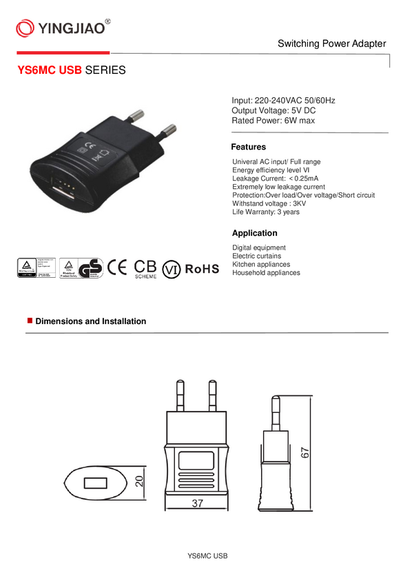 YS6MC-0501200 Zasilacz wtyczkowy, stałonapięciowy YingJiao 1.2 A 6 W