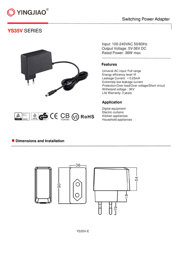 YS35V-1203000 Zasilacz wtyczkowy, stałonapięciowy YingJiao 3 A 36 W