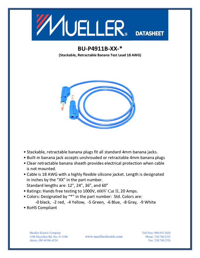 BU-P4911B-12-0 Mueller Electric BU-P4911B-12-0 Przewód pomiarowy złącze męskie bananowe zł...