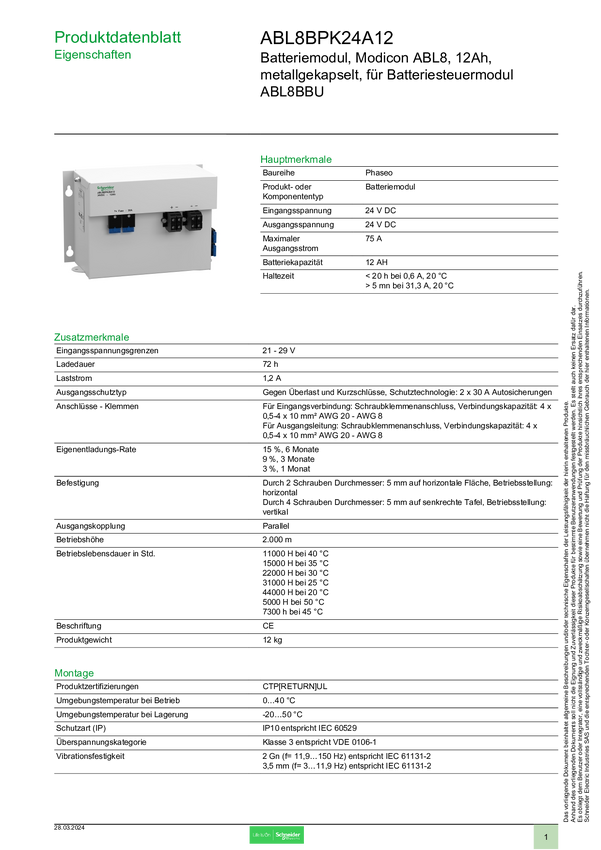 ABL8BPK24A12 Schneider Electric ABL8BPK24A12 Moduł baterii ołowiowo żelowe 12 Ah 24 V 1...