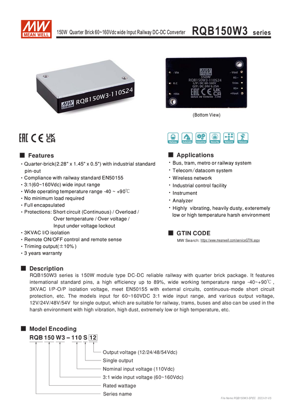 RQB150W3-110S12 MW Mean Well RQB150W3-110S12 Przetwornica DC/DC, do PCB 12.5 A 150 W Il...