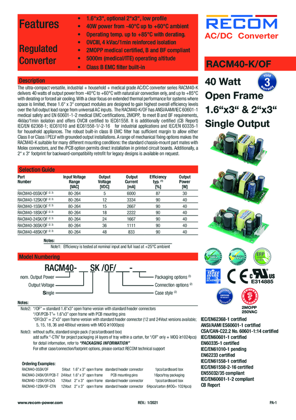 RACM40-18SK/OF Moduł zasilacza AC/DC, open frame RECOM RACM40-18SK/OF 18 V 2.222 A...