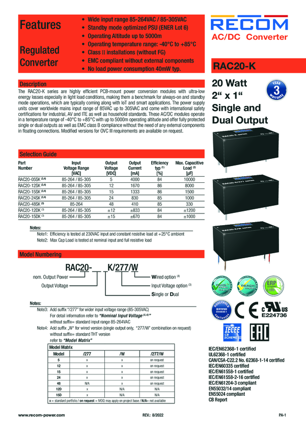RAC20-05SK/277 Zasilacz RECOM RAC20-05SK/277 5 V 4 A 20 W