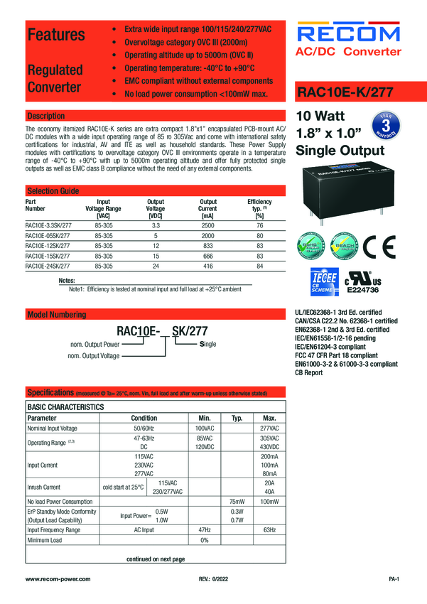 RAC10E-12SK/277 Zasilacz RECOM RAC10E-12SK/277 12 V 0.833 A 10 W