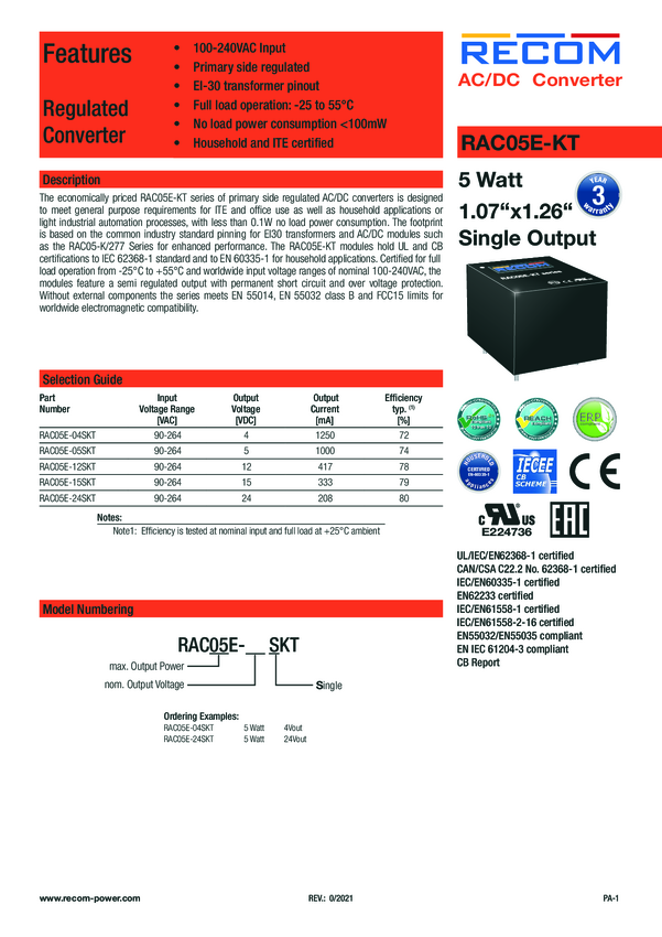 RAC05E-04SKT Zasilacz RECOM RAC05E-04SKT 4 V 1.28 A 5 W
