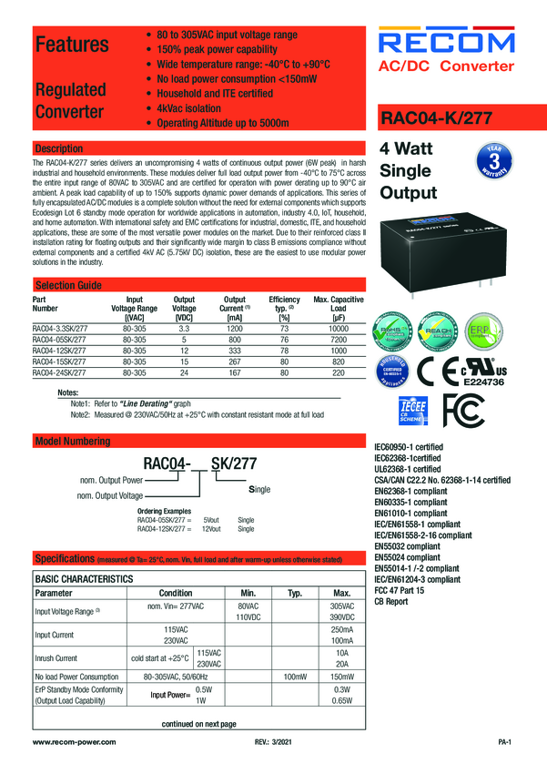 RAC04-3.3SK/277 Zasilacz RECOM RAC04-3.3SK/277 3.30 V 1.2 A 4 W
