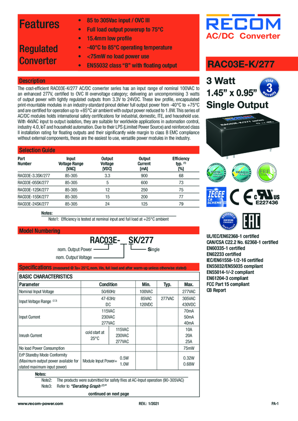 RAC03E-05SK/277 Zasilacz RECOM RAC03E-05SK/277 5 V 0.6 A 3 W