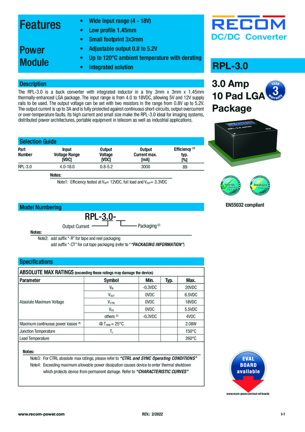 RPL-3.0-CT RECOM RPL-3.0-CT Przetwornica DC/DC RPL-3.0-CT, 15 W, 3 V, 3 A, 1 szt.
