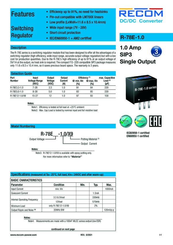 R-78E12-1.0/X9 RECOM R-78E12-1.0/X9 Przetwornica DC/DC R-78E12-1.0/X9, 12 W, 1...