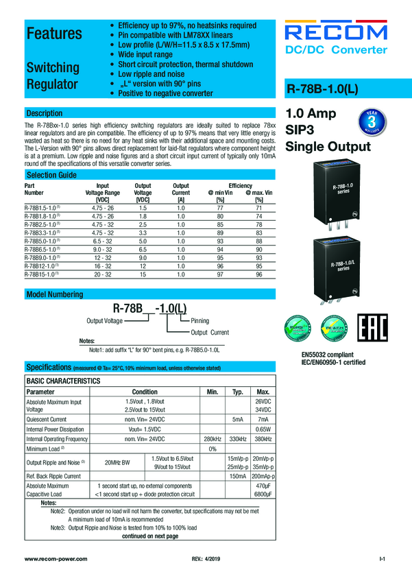 R-78B6.5-1.0L RECOM R-78B6.5-1.0L Przetwornica DC/DC R-78B6.5-1.0L, 6.5 W, 6.50 V, 1...