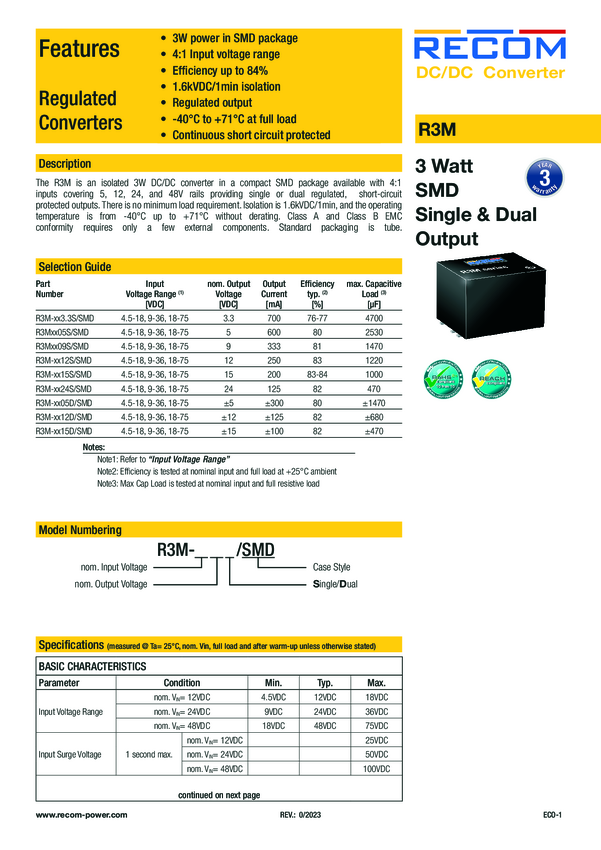 R3M-1205S/SMD RECOM R3M-1205S/SMD Przetwornica DC/DC R3M-1205S/SMD, 3 W, 5 V,...