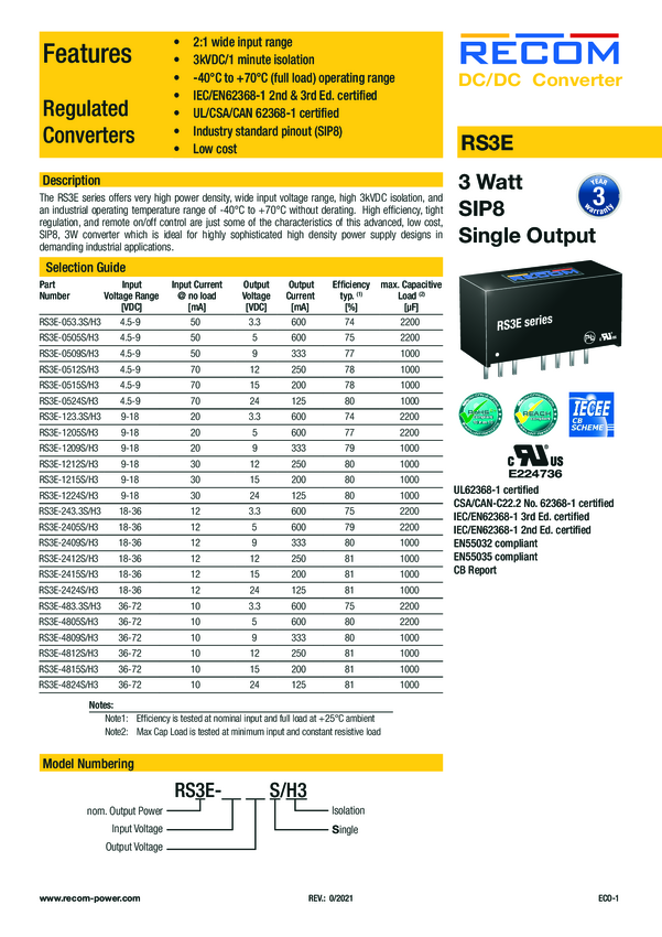 RS3E-0505S/H3 RECOM RS3E-0505S/H3 Przetwornica DC/DC RS3E-0505S/H3, 3 W, 5 V,...