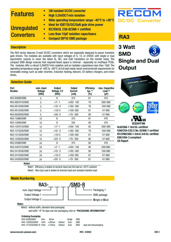 RA3-242005D/SMD RECOM RA3-242005D/SMD Przetwornica DC/DC RA3-242005D/SMD, 3 W,...