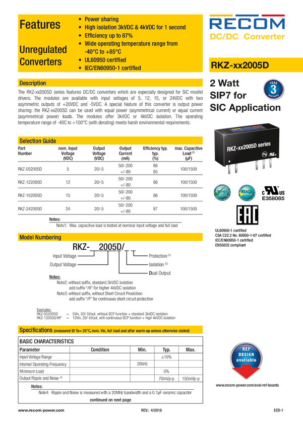 RKZ-122005D RECOM RKZ-122005D Przetwornica DC/DC RKZ-122005D, 2 W, -5 V, 20 V, mA,...