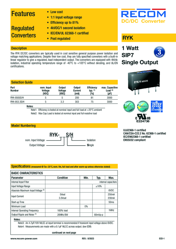 RYK-0505S/H RECOM RYK-0505S/H Przetwornica DC/DC 5 V 200 A 1 W Ilość wyjść: 1 x...