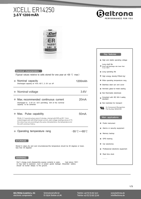 ER14250 Bateria 1/2 AA XCell, 3.6 V, 1200 mAh, litowe, 1 szt.