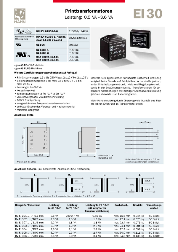BV EI 301 3582 Transformator BV EI 301 3582 Hahn BV EI 301 3582 N/A N/A