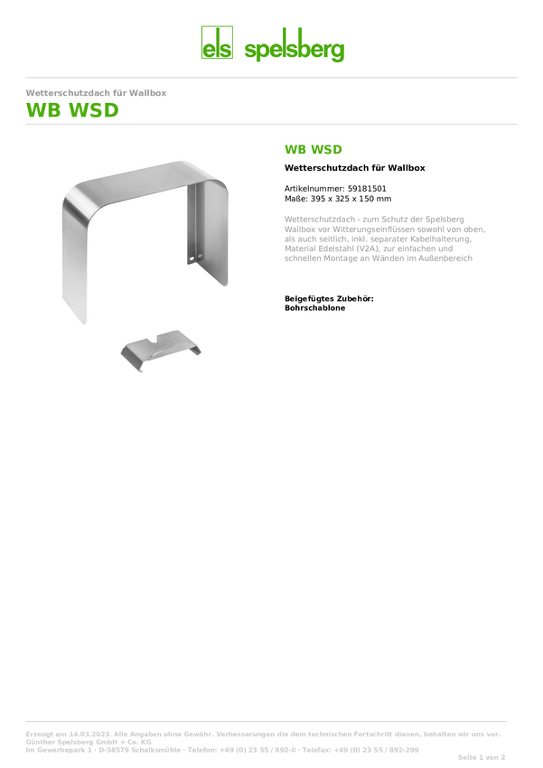 59181501 Dach chroniący przed warunkami atmosferycznymi dla Wallbox Stele Spelsberg...