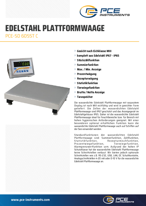 PCE-SD 60SST C PCE Instruments Waga platformowa Zakres pomiaru maks. 150 kg Podziałka 20 g...