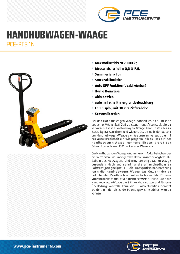 PCE-PTS 1N PCE Instruments Waga paletowa Zakres pomiaru maks. 2000 kg Podziałka 1000 g...