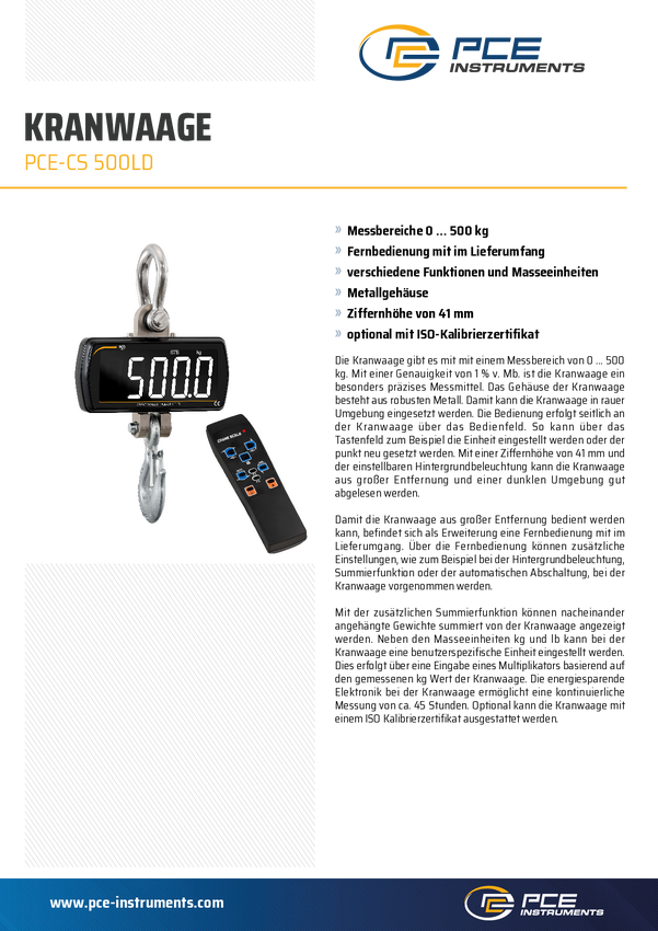 PCE-CS 500LD PCE Instruments Waga dźwigowa Zakres pomiaru maks. 500 kg bateryjne czarny