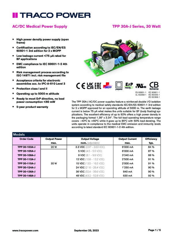 TPP 30-105A-J Zasilacz TracoPower TPP 30-105A-J 5.5 V/DC 6000 mA 30 W