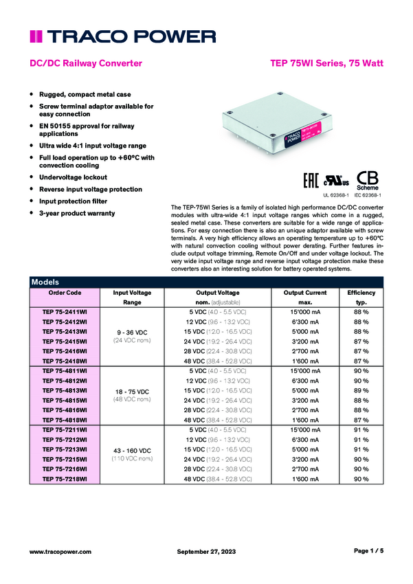 TEP 75-7215WI TracoPower TEP 75-7215WI Przetwornica DC/DC, element konstrukcyjny TEP...