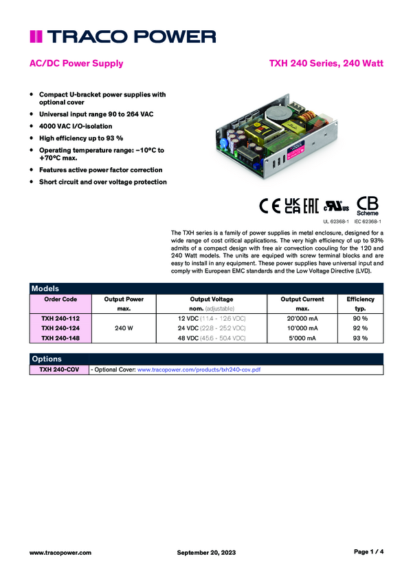 TXH 240-148 Zasilacz TracoPower TXH 240-148 48 V/DC 5 A 240 W