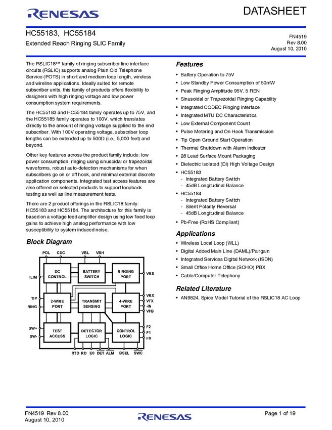 HC55183ECMZ96 Extended Reach Ringing SLIC Family