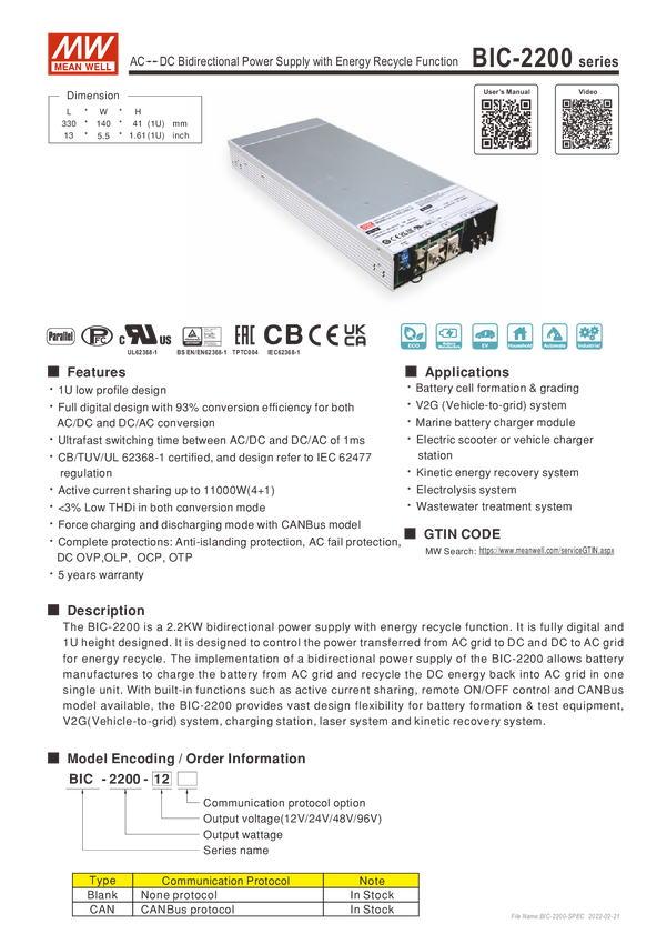 BIC-2200-48CAN Zasilacz przemysłowy MW Mean Well BIC-2200-48CAN 48 V 45 A 2160 W