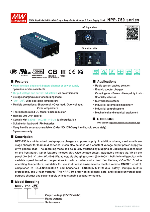 NPP-750-12 Ładowarka akumulatorów kwasowo-ołowiowych MW Mean Well NPP-750-12 12 V 43 A