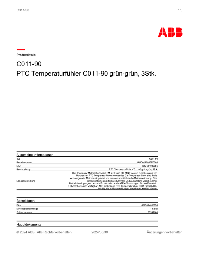 GHC0110003R0003 Czujnik temperatury typu PTC ABB C011-90, GHC0110003R0003