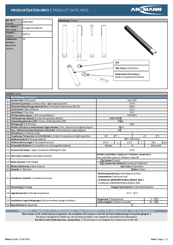 1900-0108 Bateria AAA/R03 Ansmann Vorteilspack +2 Stiftleuchten PLC20B 1.5 V 40 s...