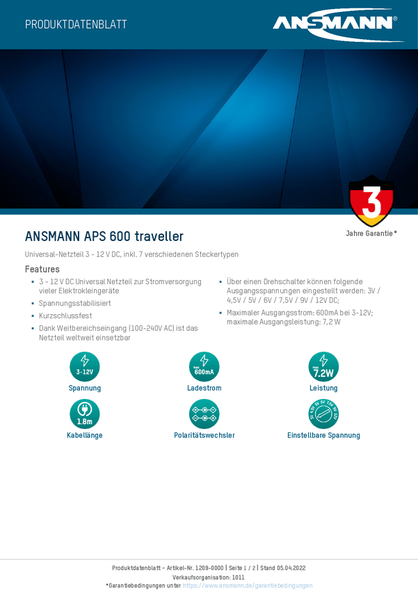 1209-0000 Zasilacz wtyczkowy, regulowany Ansmann APS 600 Traveller 600 mA 7.2 W