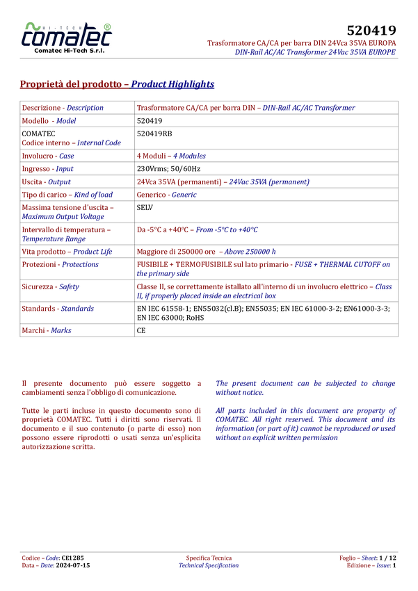 Zasilacz na szynę DIN Comatec TBD203524F4 TBD203524F4 24 V/AC 1.46 A 35 VA