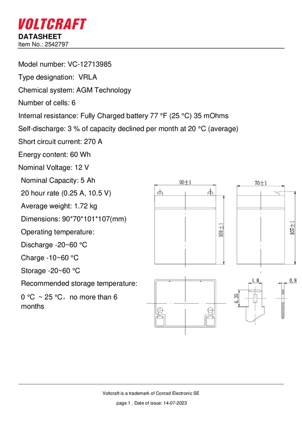 Akumulator ołowiowy VOLTCRAFT CE12V/5Ah VC-12713985, AGM, 12 V, 5 Ah