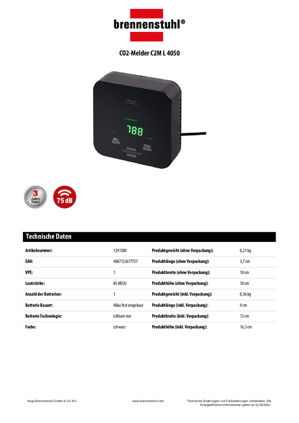 1291500 Miernik dwutlenku węgla Brennenstuhl C2M L 4050