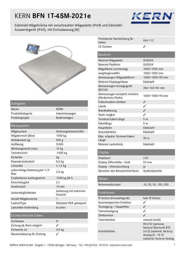 BFN 1T-4SM Kern BFN1T4SM Waga do ciała Zakres pomiaru maks. 1500 kg Podziałka 500 g z...