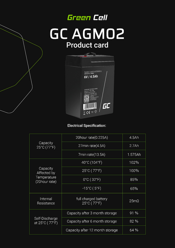 AGM02 Akumulator ołowiowy Green Cell AGM02 AGM02, ołowiowo żelowe, 6 V, 4.5 Ah