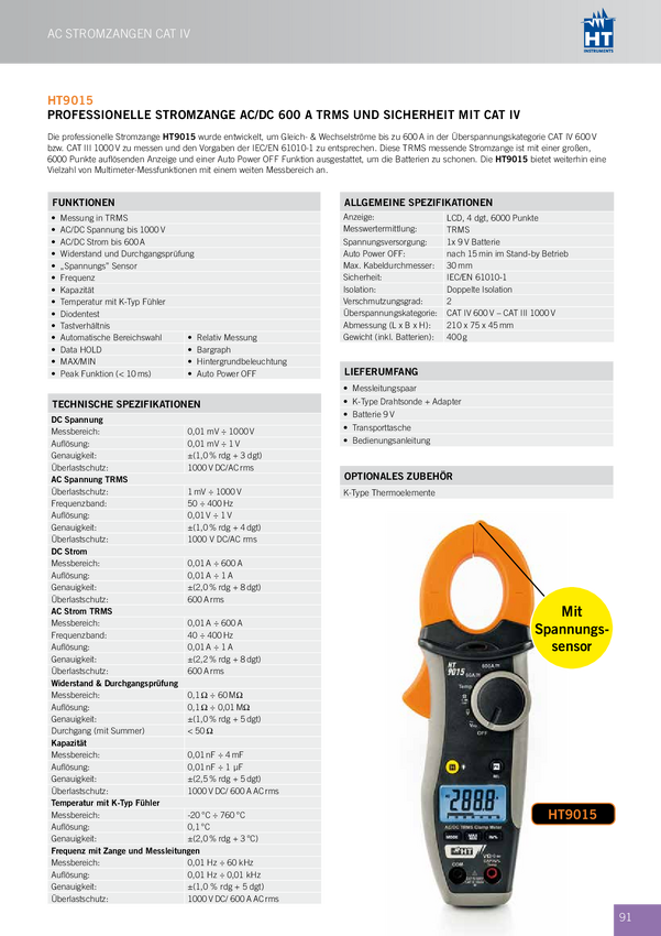 Miernik cęgowy cyfrowy HT Instruments HT9015 1009015, CAT III 1000 V, CAT IV 600 V, AC/DC, kalibracja DAkkS