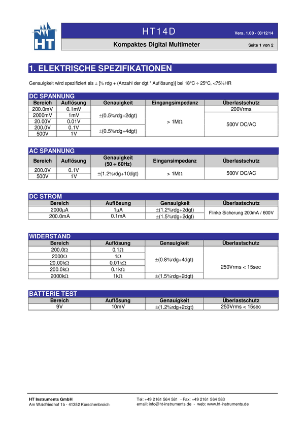 Multimetr cyfrowy HT Instruments HT14D 1010160, CAT II 600 V, CAT III 300 V, AC/DC, kalibracja DAkkS