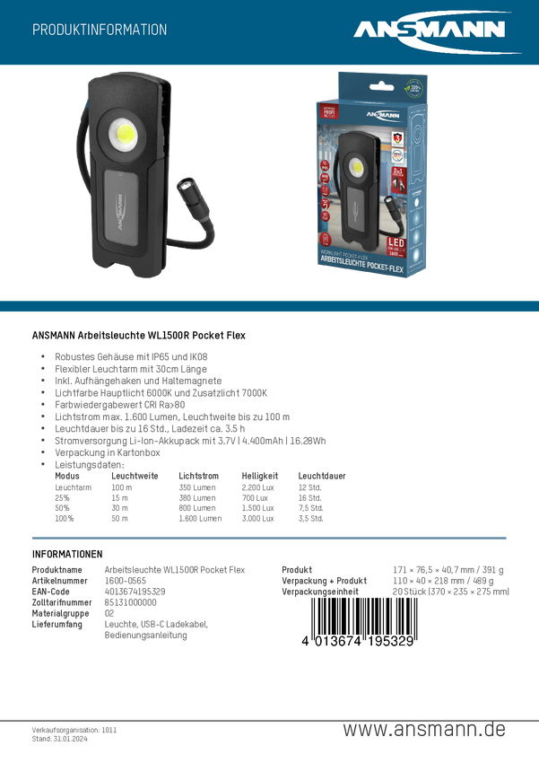 1600-0565 Ansmann 1600-0565 Worklight-WL1500R-Pocket-Flex LED Lampa robocza akumulato...
