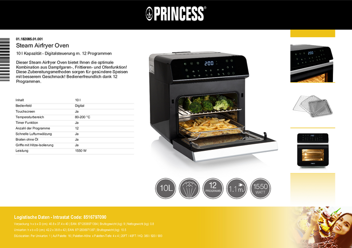 Princess 01.182085.01.001 Frytkownica 10 l 1550 W programowana temperatura, z funkcją timera, funkcja gorącego powietrza