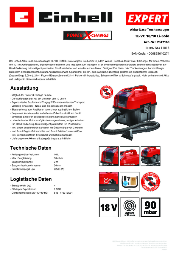 Odkurzacz do pracy na sucho i mokro Einhell Power X-Change TE-VC 18/10 Li 1668363+2188165 10 l 1 zest.