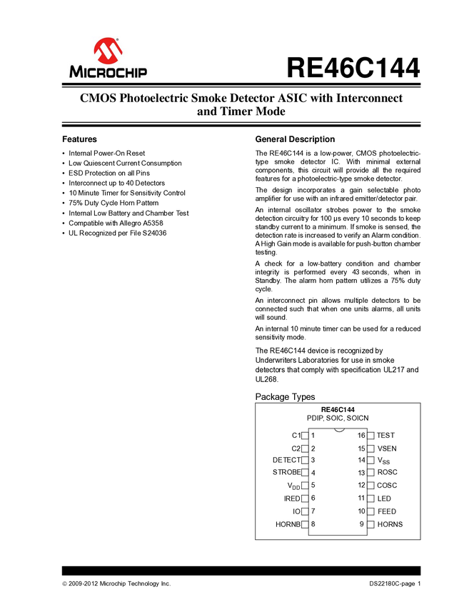 RE46C144 - CMOS Photoelectric Smoke Detector ASIC w/ Interconnect and Timer Mode