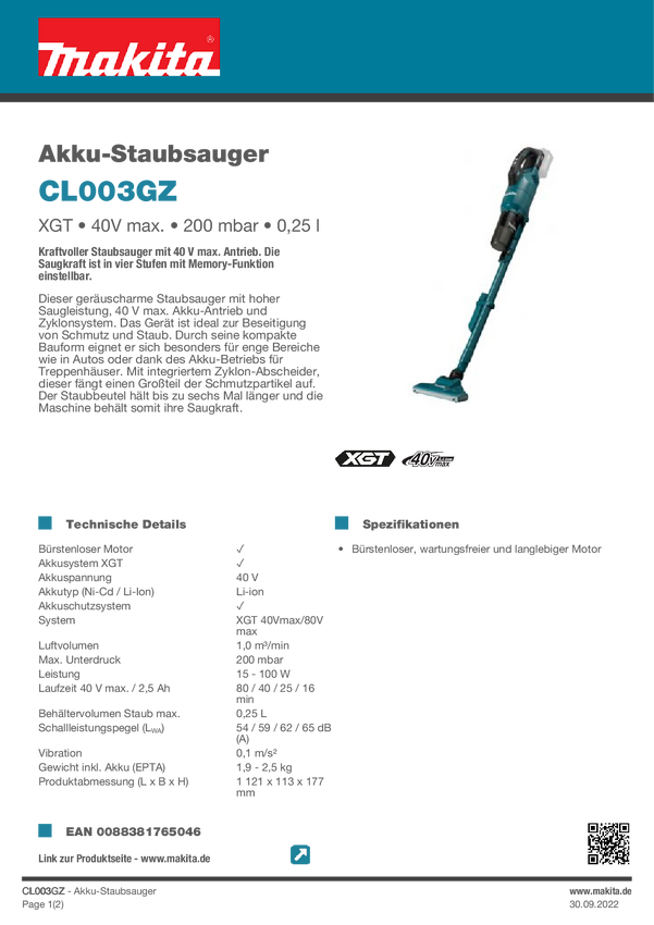 CL003GZ Makita CL003GZ CL003GZ Odkurzacz ręczny, akumulatorowy 100 W bez akumulator...