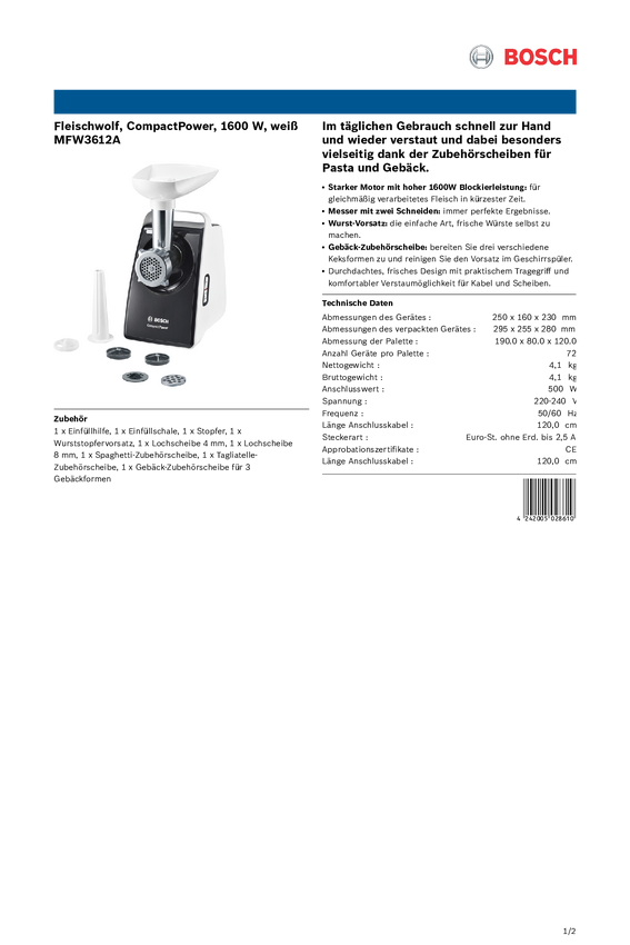 MFW3612A Maszynka do mielenia Bosch Haushalt MFW3612A, MFW3612A, 500 W, biały, czarn...