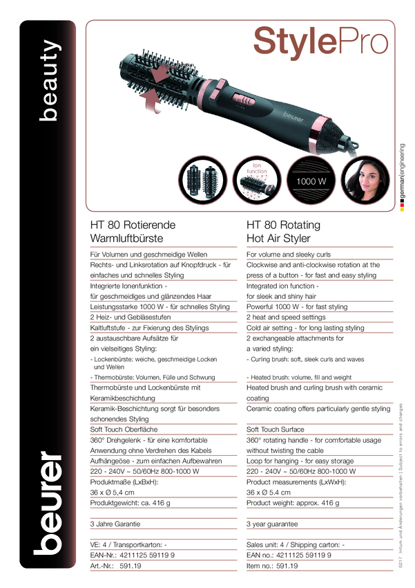 59119 Szczotka z gorącym powietrzem Beurer 59119 HT 80, 1000 W, czarny